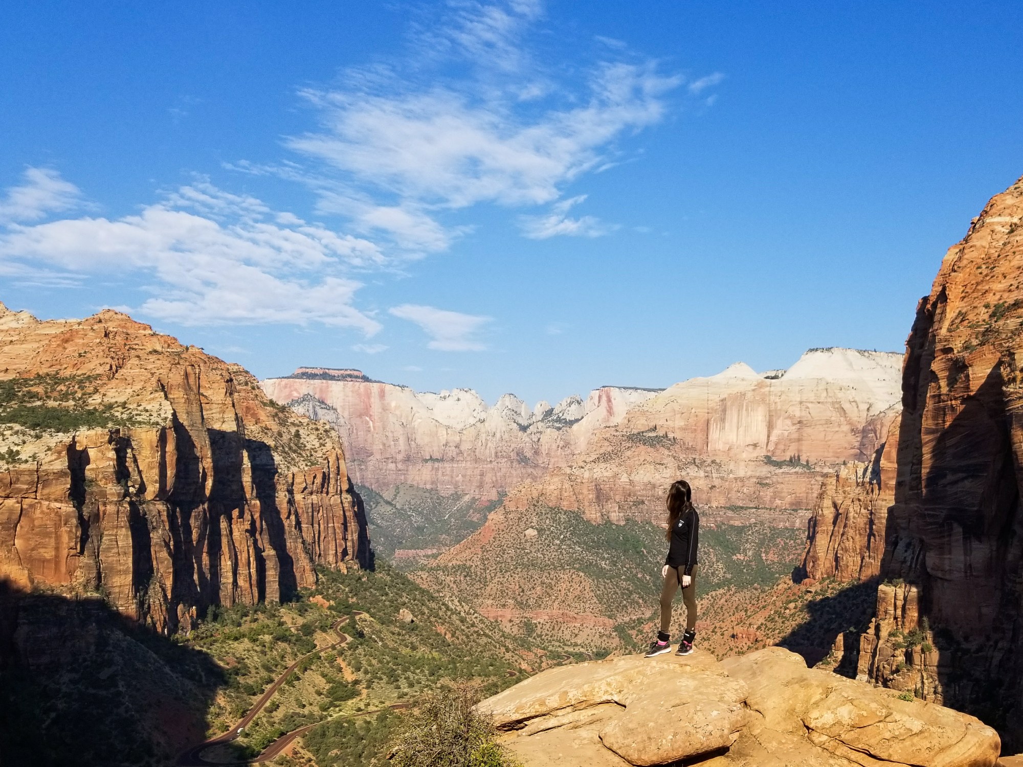 The Canyon Overlook Trail has views of the canyon that are similar to Angels Landing, but the trail is only one mile long. The entrance to the trail is located just east of the tunnel, and there is not a lot of room for parking, so make sure to get there early. We did the hike while the sun was rising, and it was so quiet and peaceful. We barley saw anyone else on the trail.  The elevation gain on the trail is 163 feet, and the overall peak of the trail is 5300 feet. The trail is very beautiful, and you go through a small cave, go across a small bridge, and mostly walk along stone. Once we reached the end of the trail and the canyon overlook, I almost dropped my phone off the edge, so definitely be careful!!!